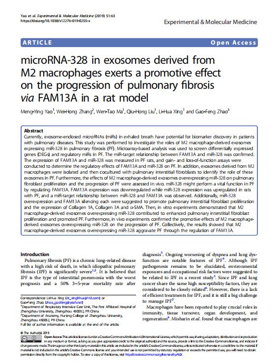 【文獻(xiàn)標(biāo)題】 microRNA-328 in exosomes derived from M2 macrophages exerts a promotive effect on the progression of pulmonary fibrosis via FAM13A in a rat model