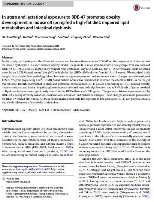 【文獻標(biāo)題】 In utero and lactational exposure to BDE-47 promotes obesity development in mouse offspring fed a high-fat diet: impaired lipid metabolism and intestinal dysbiosis