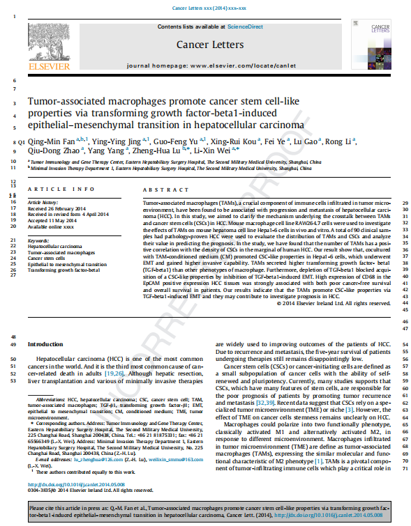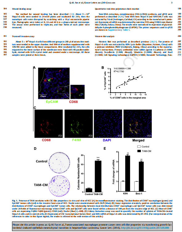 【文獻標題】Tumor-associated macrophages promote cancer stem cell-like 4 properties via transforming growth factor-beta1-induced 5 epithelial–mesenchymal transition in hepatocellular carcinoma