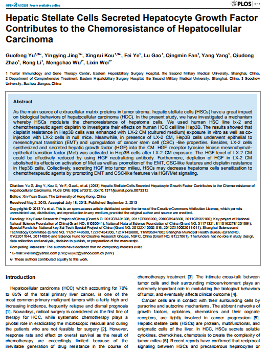 【文獻標題】Hepatic Stellate Cells Secreted Hepatocyte Growth Factor Contributes to the Chemoresistance of Hepatocellular Carcinoma