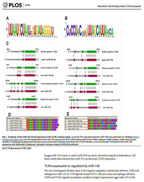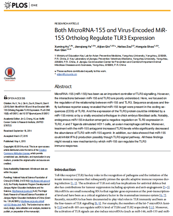 【文獻(xiàn)標(biāo)題】Both MicroRNA-155 and Virus-Encoded MiR-155 Ortholog Regulate TLR3 Expression
