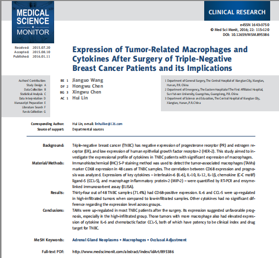 【文獻(xiàn)標(biāo)題】Expression of Tumor-Related Macrophages and Cytokines After Surgery of Triple-Negative Breast Cancer Patients and its Implications