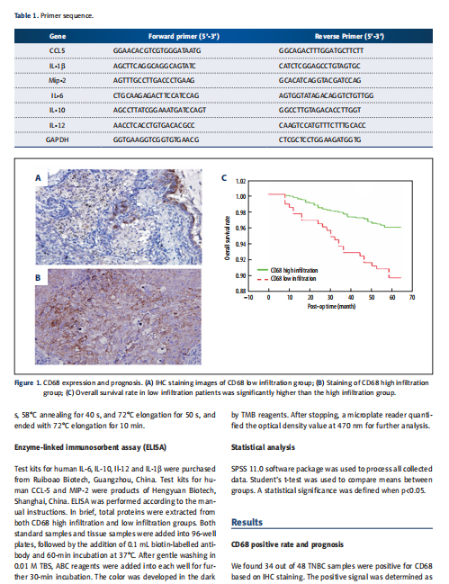 Test kits for human IL-6, IL-10, Il-12 and IL-1b were purchased from Ruiboao Biotech, Guangzhou, China. Test kits for human CCL-5 and MIP-2 were products of Hengyuan Biotech, Shanghai, China. ELISA was performed according to the manual instructions. In brief, total proteins were extracted from both CD68 high infiltration and low infiltration groups. Both standard samples and tissue samples were added into 96-well plates, followed by the addition of 0.1 mL biotin-labelled antibody and 60-min incubation at 37℃. After gentle washing in 0.01 M TBS, ABC reagents were added into each well for further 30-min ncubation. The color was developed in the dark by TMB reagents. After stopping, a microplate reader quantified the optical density value at 470 nm for further analysis.