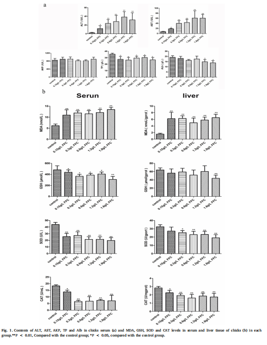 FFC (purity≥95%) were purchased from Shenniu Biological Technical Co. Ltd (Shandong, China). Alanine aminotransferase (ALT) and aspartate aminotransferase (AST) assay kits were purchased from the Nanjing Jiancheng Bioengineering Institute (Nanjing, China).Commercial kits for detecting chicken cytochromeP450 1A1(CYP1A1) and CYP2H1 were purchased from Shanghai hengyuan Biotech CO.,Ltd (Shanghai china). Other chemicals used in these experiments of analytical grade were from commercial sources.
