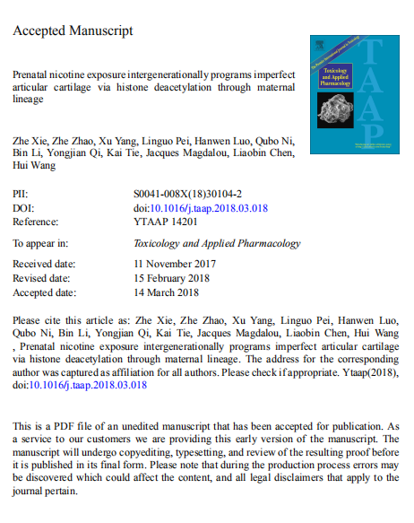 【文獻標(biāo)題】Prenatal nicotine exposure intergenerationally programs imperfect articular cartilage via histone deacetylation through maternal lineage