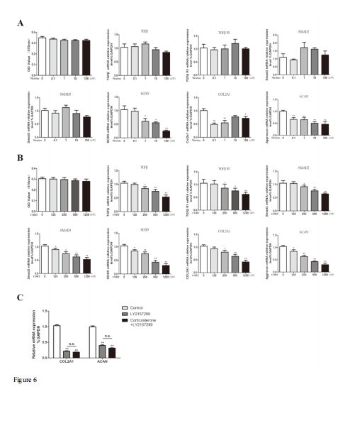 Nicotine (CAS no. 54-11-5) was obtained from Sigma-Aldrich (St. Louis, MO, USA). Safranin O (CAS no. 477-73-6) and fast green (CAS no. 2353-45-9) were purchased from Hengyuan Biotech (HengYuan Biological Technology Co., Ltd, Shanghai, China). Trizol reagent kits were obtained from Omega BioTek (Doraville, GA, USA). Exscript RT reagent kit and SYBR(R) Premix Ex TaqTM were obtained from TaKaRa Biotechnology (Dalian, China). Oligonucleotide primers for analyzed genes were synthesized by Sangon Biotech (Shanghai, China). DMEM/F12 (1:1) and fetal bovine serum were supplied by Gibco (St. Louis, MO, USA). Polyclonal antibodies for COL2A1, SOX9, TGFβ, TGFβ receptor 1 (TGFβR1) and Smad2/3 were purchased from Santa Cruz Biotechnology (Santa Cruz, CA, USA). Other chemicals and agents were of analytical grade.
