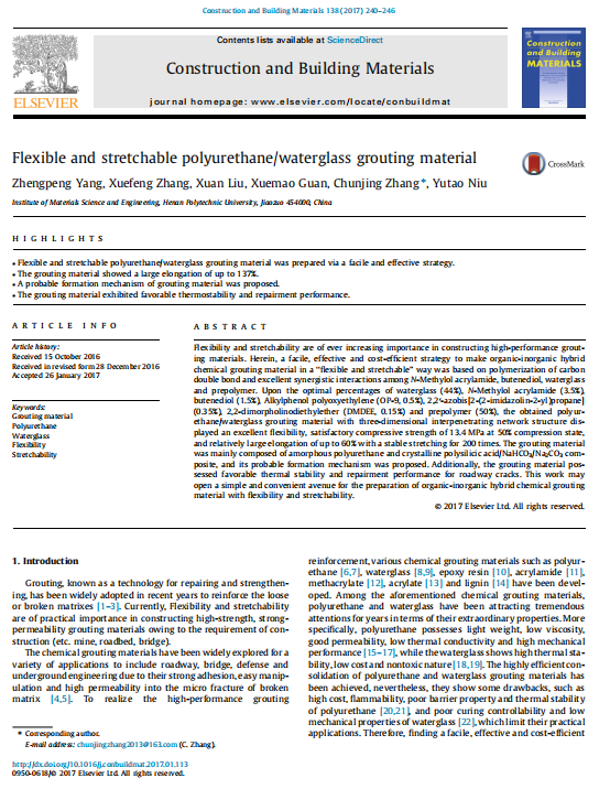 【文獻標題】Flexible and stretchable polyurethane/waterglass grouting material
