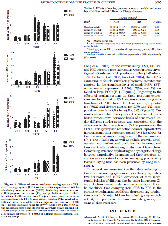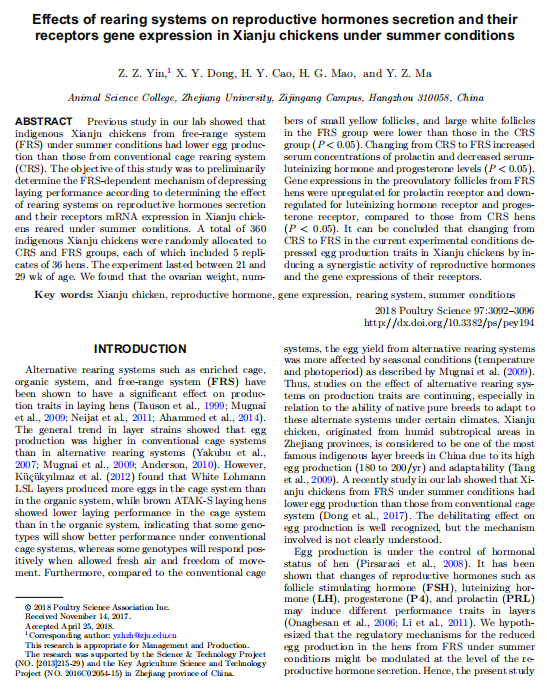 【文獻(xiàn)標(biāo)題】Effects of rearing systems on reproductive hormones secretion and their receptors gene expression in Xianju chickens under summer conditions
