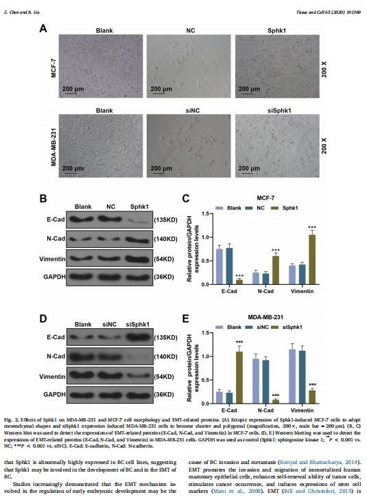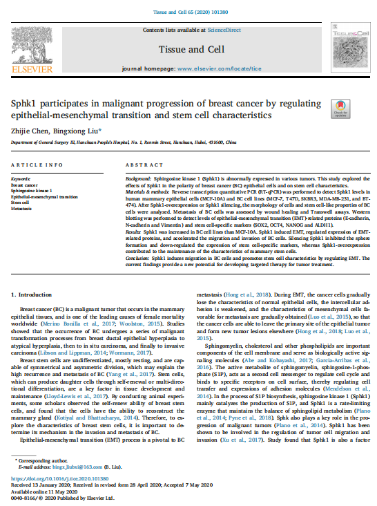 【文獻(xiàn)標(biāo)題】Sphk1 participates in malignant progression of breast cancer by regulating epithelial-mesenchymal transition and stem cell characteristics