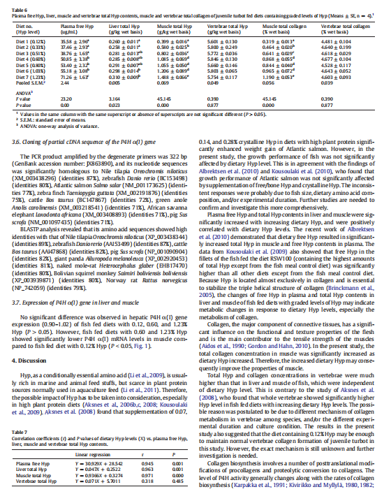 【文獻(xiàn)標(biāo)題】Effects of dietary hydroxyproline on growth performance, body composition, hydroxyproline and collagen concentrations in tissues in relation to prolyl 4-hydroxylase α(I) gene expression of juvenile turbot, Scophthalmus maximus L. fed high plant protein diets