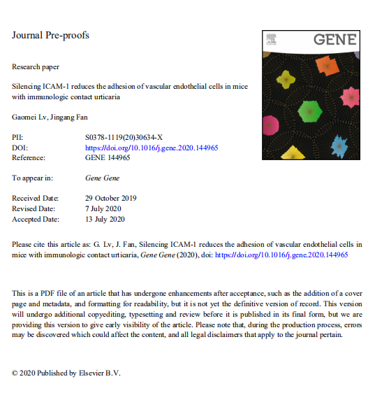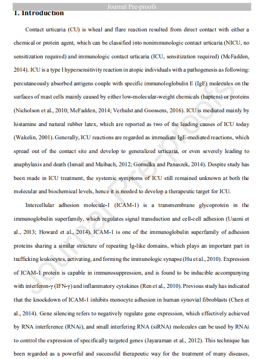 【文獻標題】Silencing ICAM-1 reduces the adhesion of vascular endothelial cells in mice with immunologic contact urticaria