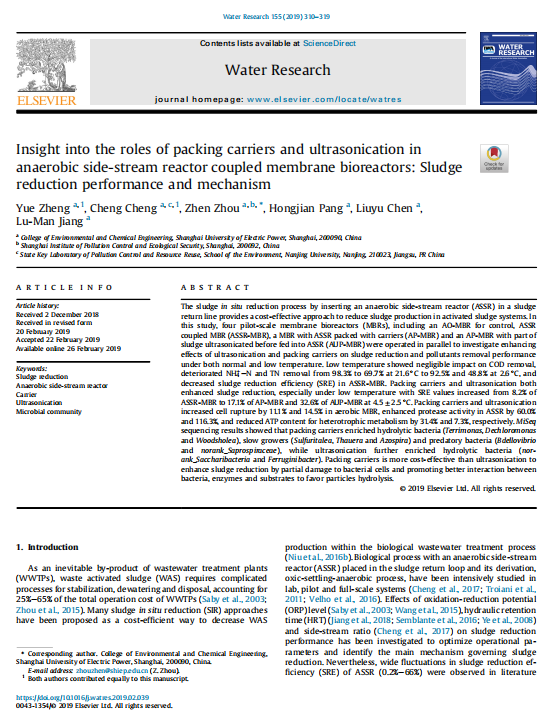 【文獻標題】Insight into the roles of packing carriers and ultrasonication in anaerobic side-stream reactor coupled membrane bioreactors: Sludge reduction performance and mechanism