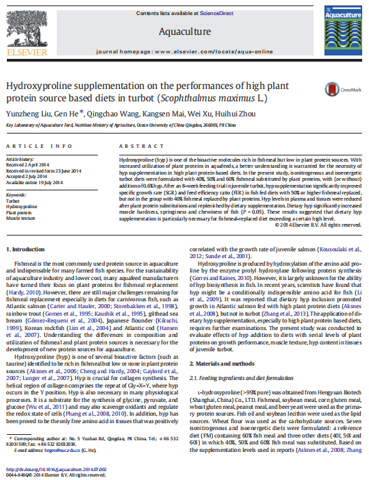 【文獻(xiàn)標(biāo)題】Hydroxyproline supplementation on the performances of high plant protein source based diets in turbot (Scophthalmus maximus L.)