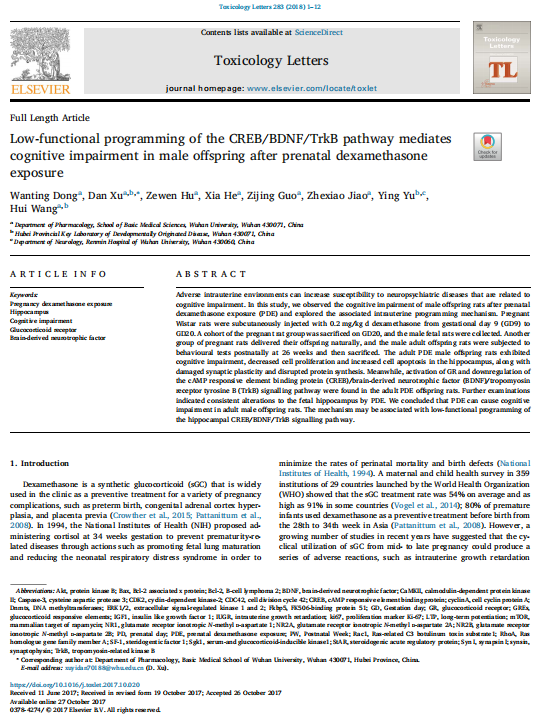 【文獻(xiàn)標(biāo)題】Low-functional programming of the CREB/BDNF/TrkB pathway mediates cognitive impairment in male offspring after prenatal dexamethasone exposure
