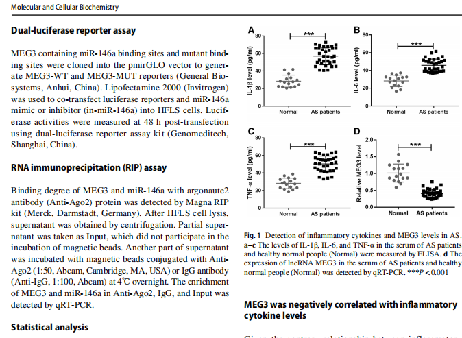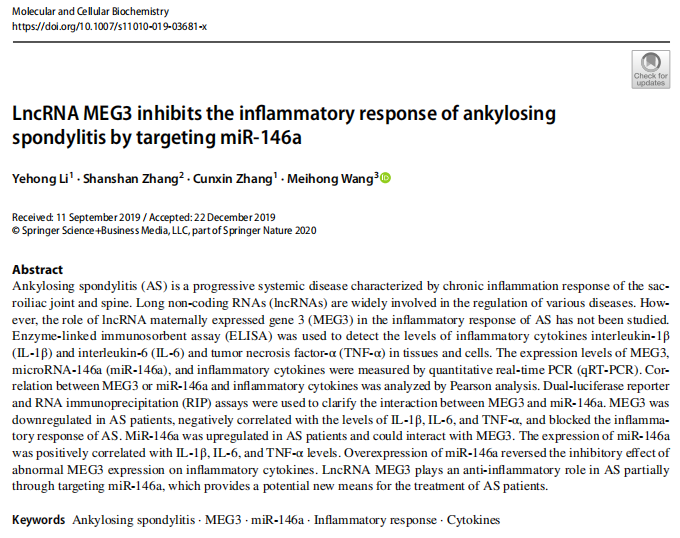 【文獻(xiàn)標(biāo)題】LncRNA MEG3 inhibits the infammatory response of ankylosing spondylitis by targeting miR‑146a