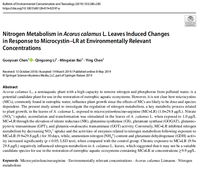 【文獻(xiàn)標(biāo)題】Nitrogen Metabolism in Acorus calamus L. Leaves Induced Changes in Response to Microcystin–LR at Environmentally Relevant Concentrations