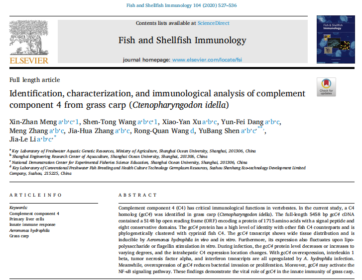 【文獻(xiàn)標(biāo)題】Identification, characterization, and immunological analysis of complement component 4 from grass carp (Ctenopharyngodon idella)