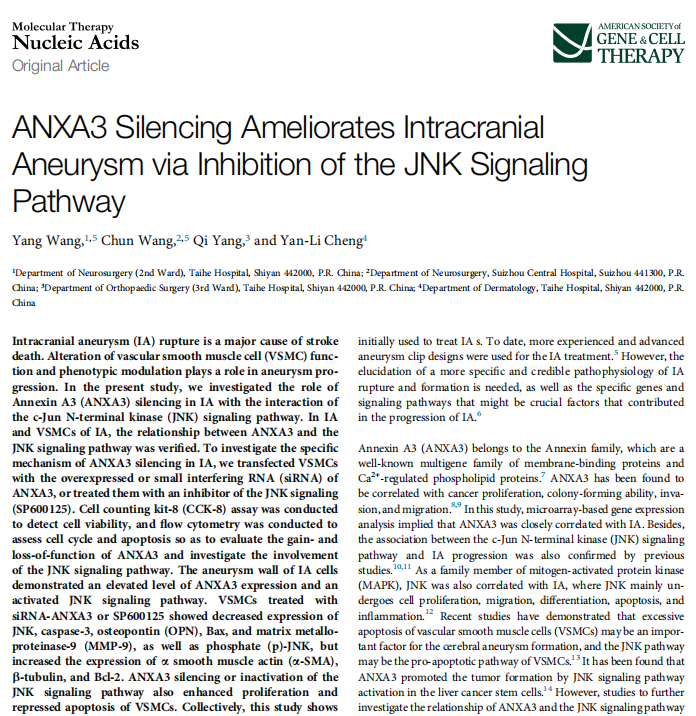 【文獻標題】ANXA3 Silencing Ameliorates Intracranial Aneurysm via Inhibition of the JNK Signaling Pathway