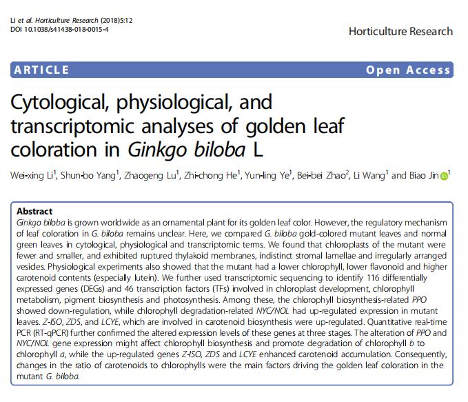 【文獻(xiàn)標(biāo)題】Cytological, physiological, and transcriptomic analyses of golden leaf coloration in Ginkgo biloba L