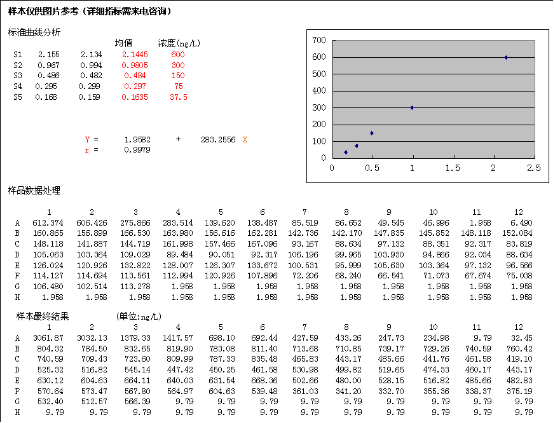 繪制標(biāo)準(zhǔn)曲線:在Excel工作表中,以標(biāo)準(zhǔn)品濃度作橫坐標(biāo),對應(yīng)OD值作縱坐標(biāo),繪制出標(biāo)準(zhǔn)品線性回歸曲線,按曲線方程計(jì)算各樣本濃度值。